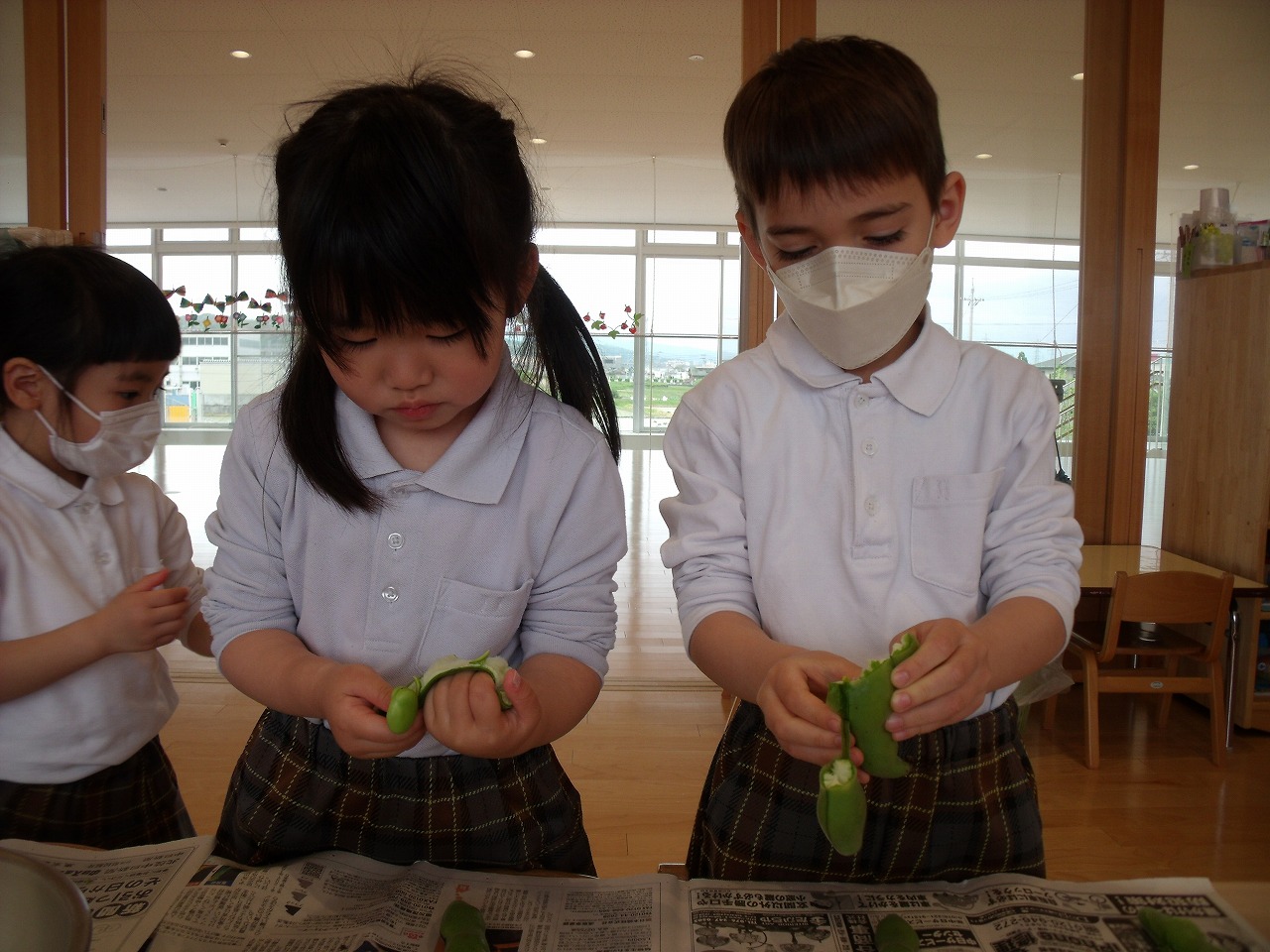おやつに食べるそら豆のさやむきをしました。絵本『そらまめくんのベッド』のさやの中のふかふかな綿毛のような感触を楽しみましたよ。